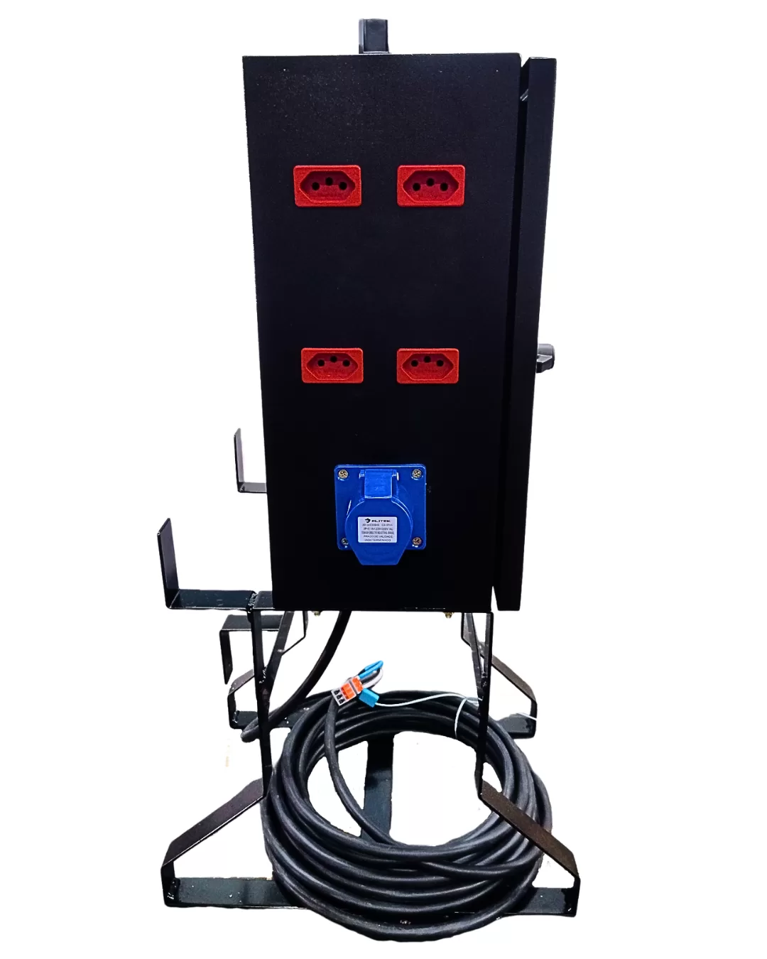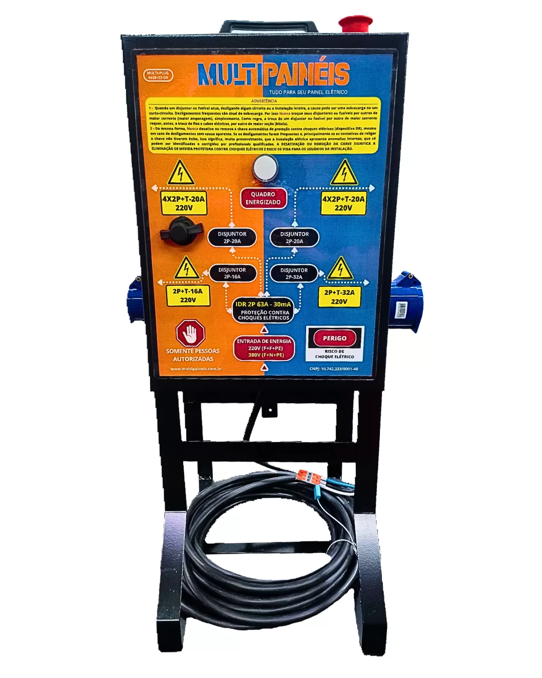 O quadro de tomadas MULTI-PLUG 4638+22-DR da MULTIPAINÉIS, tipo robô ou robozinho para canteiro de obras, oferece versatilidade, , segurança e confiabilidade obedecendo as normas técnicas e de segurança vigentes. Composto por 8 saídas de energia em tomadas 220V 2P+T 20A + 1 Tomada Industrial (220V 2P+T 16A) + 1 Tomada Industrial (220V 2P+T 32A) a partir de uma única fonte de alimentação, seja ela 380V (F+N+PE) ou 220V (F+F+PE).